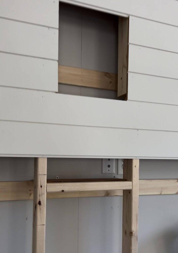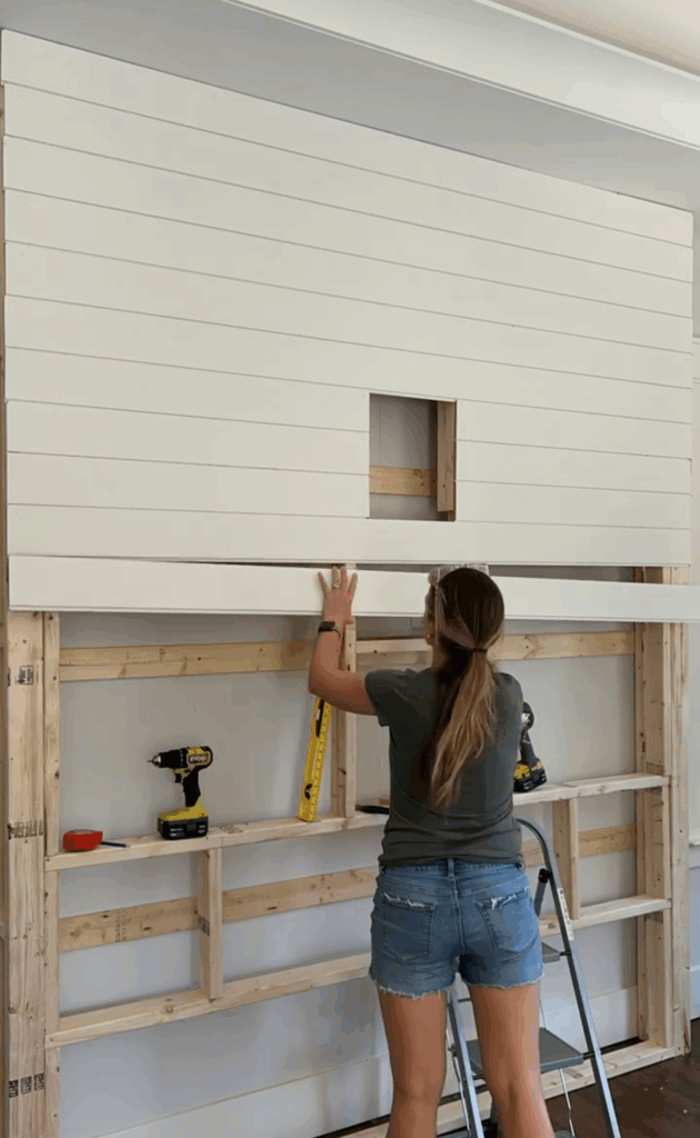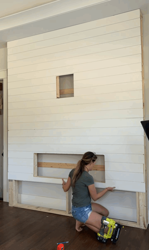 Another Tip: Before covering with shiplap, I used scrap wood to create a small interior shelf behind the shiplap for hiding our router and antenna. We then left a hole for easy access to existing outlets for TV installation.