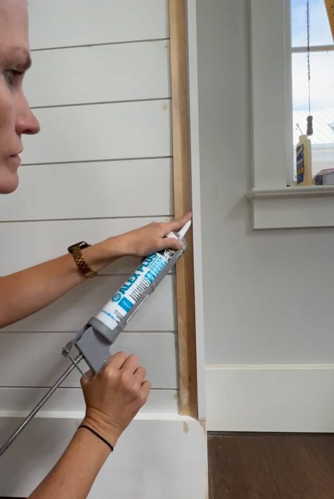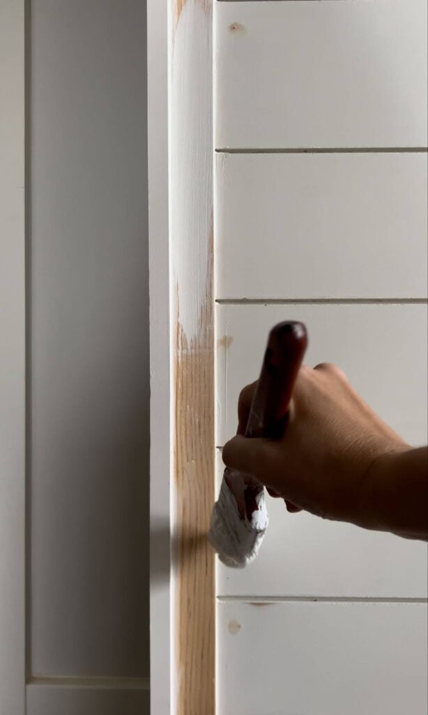 Once the shiplap was up, I added trim to all corners and edges so everything looked clean and polished. This instantly elevates the entire project and makes it look custom-built. I recommend matching your existing trim! It makes any DIY look like it was part of the original home.