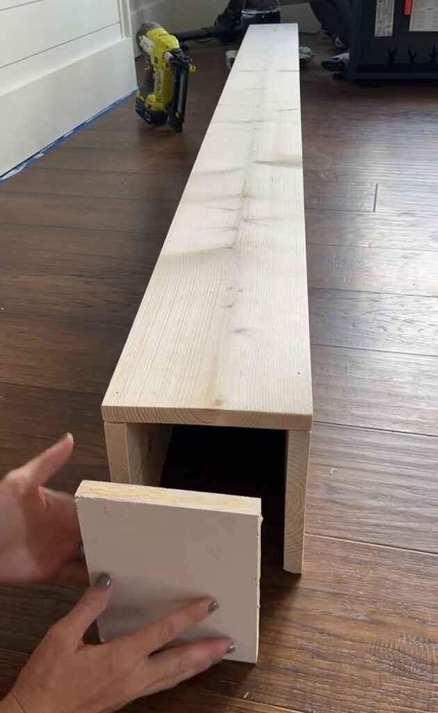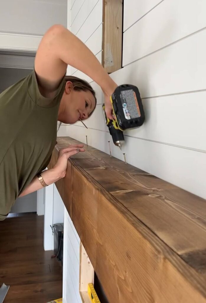 Once dry, I attached a leftover 2×4 to the studs and slid the mantel over it like a sleeve, then screwed it into place. It turned out better than I imagined!