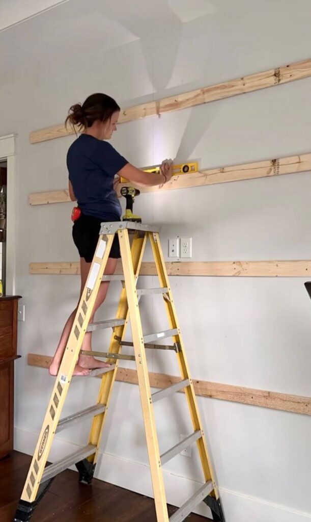 I installed four horizontal 1×4 boards directly into the studs. These act as strong anchor points for the entire fireplace structure. (Note: I meant for them to be evenly spaced, but sometimes, math is hard.😀I didn’t bother moving them because they would still serve the purpose this way.)